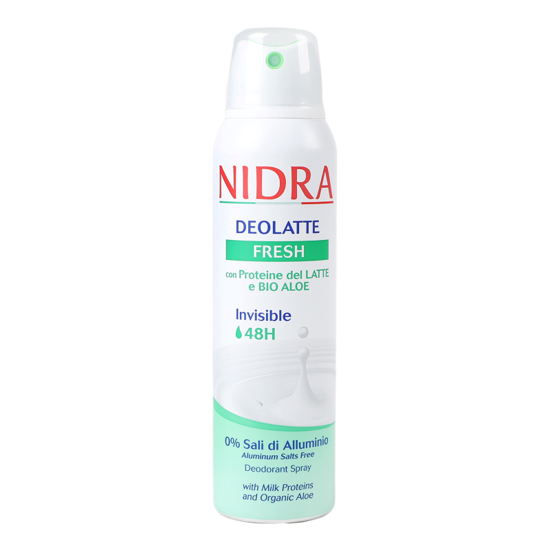 Зволожуючий дезодорант-спрей з молочними білками та алое. Ідеально підходить для тих, хто шукає тривалу свіжість. Його аромат характеризується приємними зеленими та пухнастими нотками. Формула Invisible допомагає зменшити появу плям на одязі. 48 годин делікатного захисту. Дезодорант на основі натуральних компонентів: не забиває пори, не порушуючи природний біобаланс; містить активні натуральні інгредієнти без алюмінію та спирту; не залишає слідів на одязі. Дезодорант Nidra має ніжний і обволікаючий аромат, який гарантуює тривале відчуття хорошого самопочуття та свіжості.
