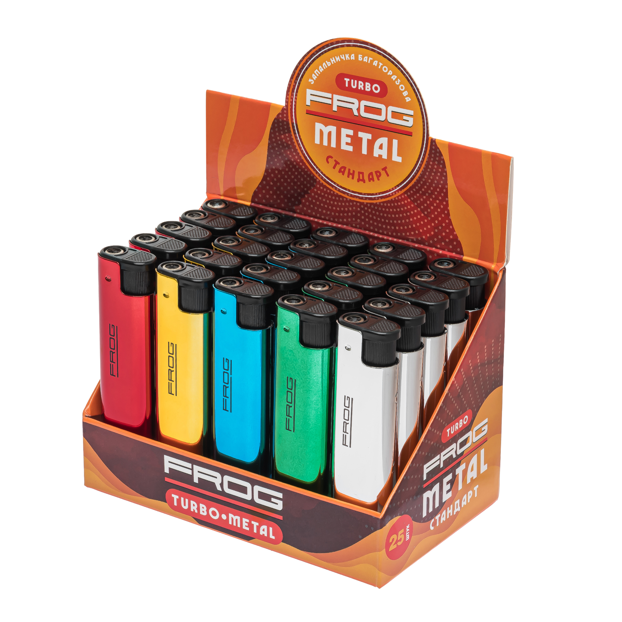 Запальничка TURBO METAL СТАНДАРТ ТМ «FROG» повнорозмірна турбозапальничка зі збільшеним об’ємом газу та потужним Jet-полум’ям. Завдяки кремнієвому механізму вона забезпечує стабільне запалювання, а металічні вставки роблять корпус міцним і довговічним.